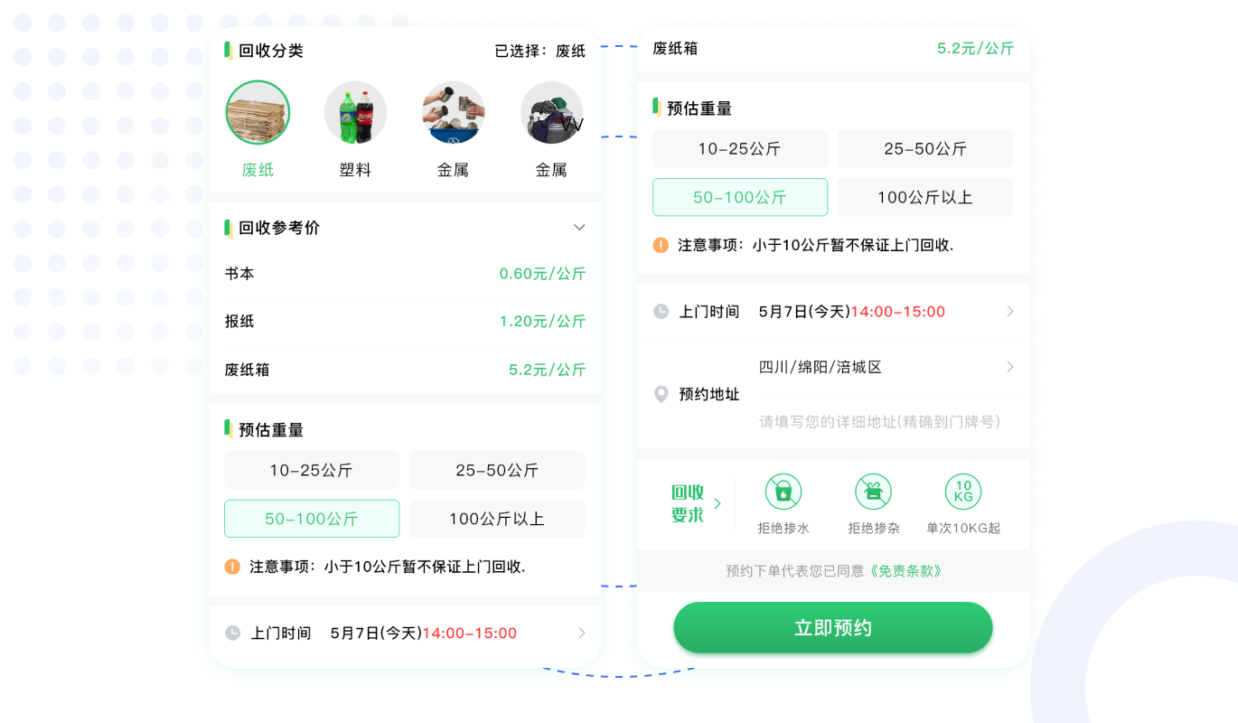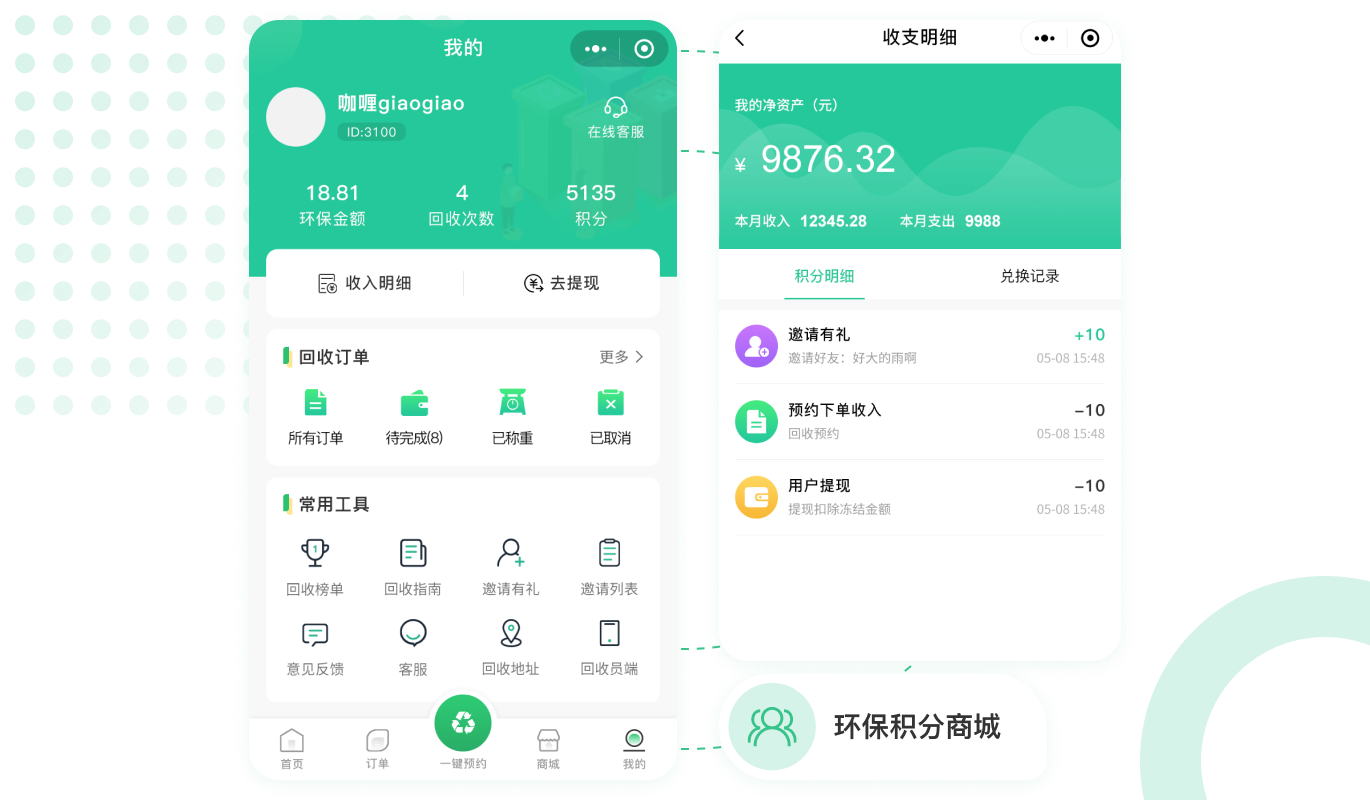 用戶出售垃圾廢品換錢的同時享受積分,積分可以兌換商品,增加用戶的使用黏性。